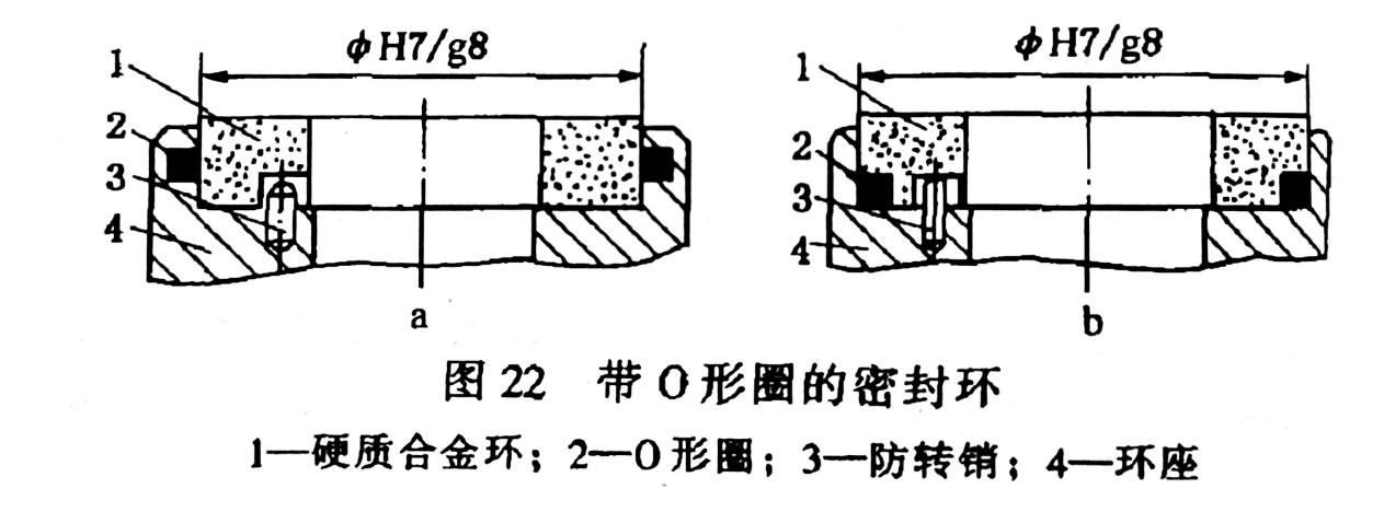 這種組合式密封環(huán)在硬質(zhì)合金環(huán)與環(huán)座之間用H7/g8的滑動(dòng)配合。在兩者配合的圓柱面間放置一聚四氟乙烯或合成橡膠制成的O形密封圈,避免其間的密封流體泄露,并且將硬質(zhì)合金環(huán)與環(huán)座結(jié)合在一起。在硬質(zhì)合金環(huán)與環(huán)座的平面結(jié)合處設(shè)一銷釘,以傳遞扭矩。此種組合結(jié)構(gòu),沒有組合應(yīng)力產(chǎn)生,也無由此引起的組合密封環(huán)的密封端面的變形,可是組合密封環(huán)零件的數(shù)量增加了,還需要在硬質(zhì)合金環(huán)上鉆孔或槽,給制造提高了難度,另外由于增設(shè)了O形圈,密封環(huán)的使用溫度受到了限制。