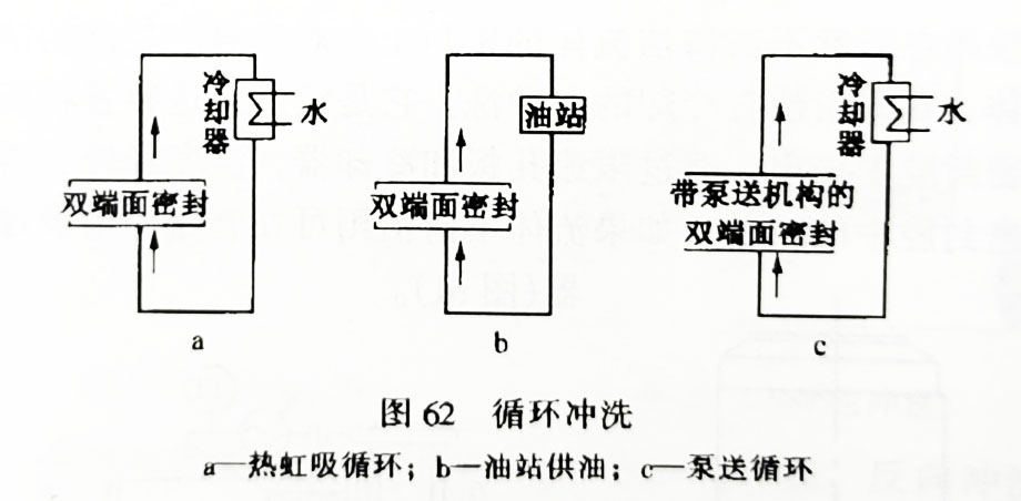 循環(huán)沖洗是經(jīng)過(guò)一個(gè)泵送裝置使外加的密封流體進(jìn)行循環(huán)(圖62)。這里有兩點(diǎn)需要引起留意,一是“泵送裝置”,可以是外加的油站和密封腔形成閉合回路進(jìn)行循環(huán),也可在密封腔中裝設(shè)一個(gè)泵,或者是用熱虹吸的原理使流體循環(huán)。另一點(diǎn)要留意的是“外加的密封流體”。這種沖洗方法用在雙端面或多端面密封上,在單端面密封上不選用。循環(huán)沖洗也有人稱為“外循環(huán)”。