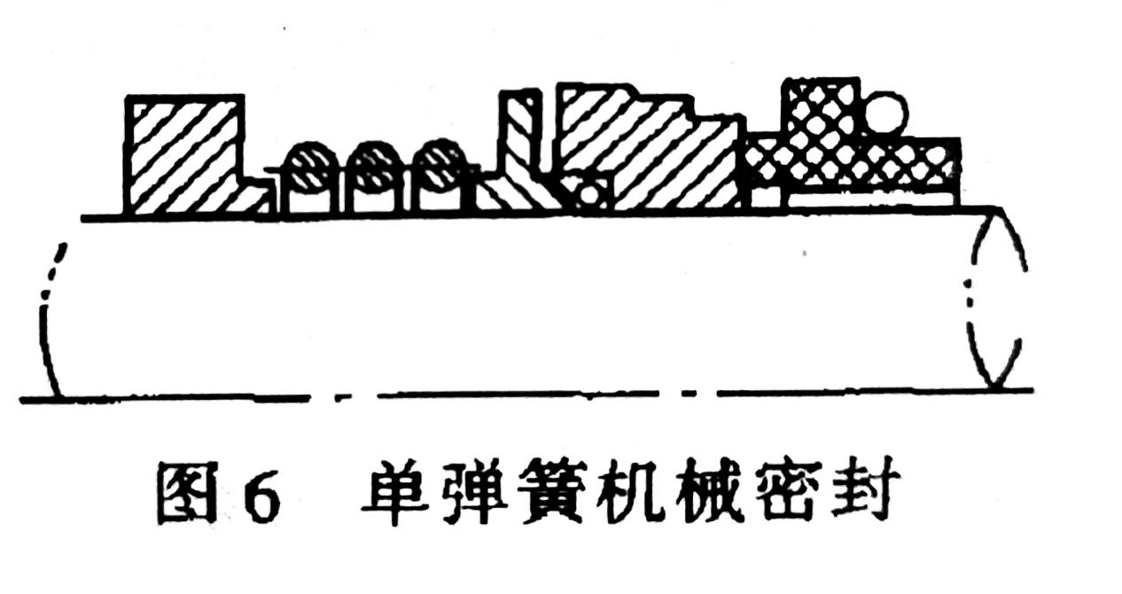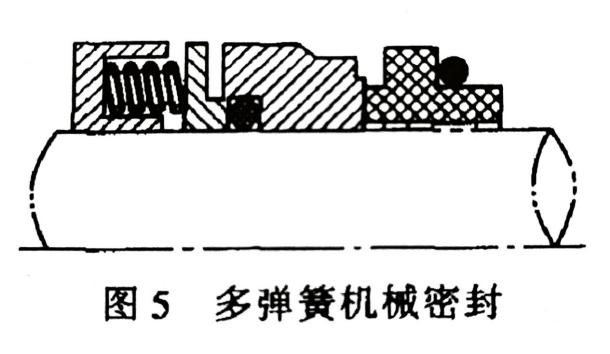 按補(bǔ)償結(jié)構(gòu)中彈簧的數(shù)量可分為多彈簧和單彈簧機(jī)械密封。補(bǔ)償結(jié)構(gòu)中有多個彈簧的密封稱為多彈簧機(jī)械密封(圖5);補(bǔ)償結(jié)構(gòu)中只有一個彈簧的機(jī)械密封稱為單彈簧機(jī)械密封(圖6)。多彈簧機(jī)械密封又稱小彈簧機(jī)械密封,這種結(jié)構(gòu)軸向長度較小,可用更改彈簧數(shù)量的辦法調(diào)節(jié)彈性力大小,軸向力較均勻,適用于高速機(jī)械密封,在腐蝕性介質(zhì)中不宜采用。單彈簧機(jī)械密封又稱大彈簧機(jī)械密封,密封結(jié)構(gòu)較為簡單。有的密封型式還用彈簧傳遞扭矩。國產(chǎn)密封應(yīng)用大彈簧較多,但不能用于高速。