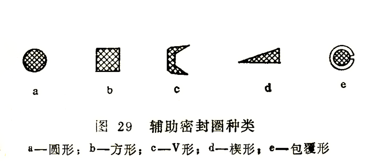 動(dòng)環(huán)和軸(軸套)以及靜環(huán)和壓蓋之間的密封靠輔助密封圈來實(shí)現(xiàn)。它們基本上歸于靜密封,當(dāng)密封端面和軸中心線不垂直時(shí),動(dòng)環(huán)密封圈沿軸向有很小的運(yùn)動(dòng)位移,其移動(dòng)量取決于密封端面和軸中心的垂直度誤差、運(yùn)動(dòng)的次數(shù)和軸轉(zhuǎn)速等。輔助密封圈的種類有很多,從材質(zhì)角度分類有合成橡膠、聚四氟乙烯和柔性石墨等;從斷面形狀分類有圓形、方形、V形、楔形及包覆形密封圈(圖29)。