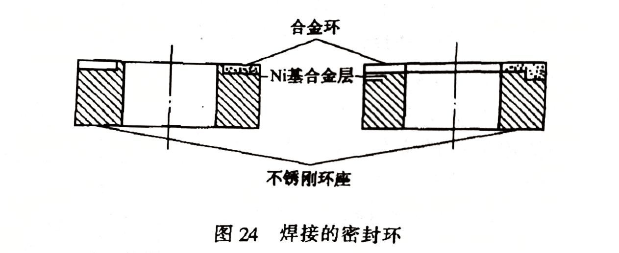 為改善熱裝式密封環(huán)松脫的問題,呈現(xiàn)了焊接的密封環(huán)(圖24)。所用的硬質(zhì)合金是以Cr3C2為硬質(zhì)相、Ni為粘結(jié)相的燒結(jié)合金材料。耐腐蝕優(yōu)于YG6等硬質(zhì)合金,高溫下具有優(yōu)異的抗氧化性能,在1000℃空氣中加熱2小時無任何變化。可是導(dǎo)熱性能較差,僅為YG6的1/3;線膨脹系數(shù)大,比YG6大1倍多,為10.2x10-6/℃(10~500℃時)。這兩點導(dǎo)致了耐熱沖擊性能不如YG6好。正因為線膨脹系數(shù)較大,和馬氏體不銹鋼接近(10~500℃時為11x10-6/℃),為和環(huán)座焊接提供了有利條件。焊接時需在環(huán)和座之間鋪放一層鎳基粉末,置于真空電阻爐中,經(jīng)1100℃高溫熔焊,然后進(jìn)行回火處理,以消除焊接應(yīng)力。由于是焊接的密封環(huán),硬質(zhì)合金環(huán)的厚度可以比YG6薄,毛坯的厚度也只要3~3.5mm。又因密度小,是YG6的一半(7~7.5g/cm3),因此,可節(jié)約貴重金屬,價格較低。這種合金的牌號為CN15,其間Cr3C2 85%、Ni 15%,由北京硬質(zhì)合金廠研制成功。