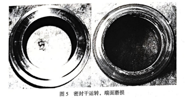 密封環(huán)有嚴(yán)重的磨損和凹槽,金屬環(huán)表面有擦亮的傷痕,有的是徑向裂紋、熱裂,變黃,嚴(yán)重的變藍(lán)和變黑。輔助密封0形環(huán)老化、硬化、炭化和開裂等,石墨環(huán)上有唱片狀的同心紋理等(圖5)。
