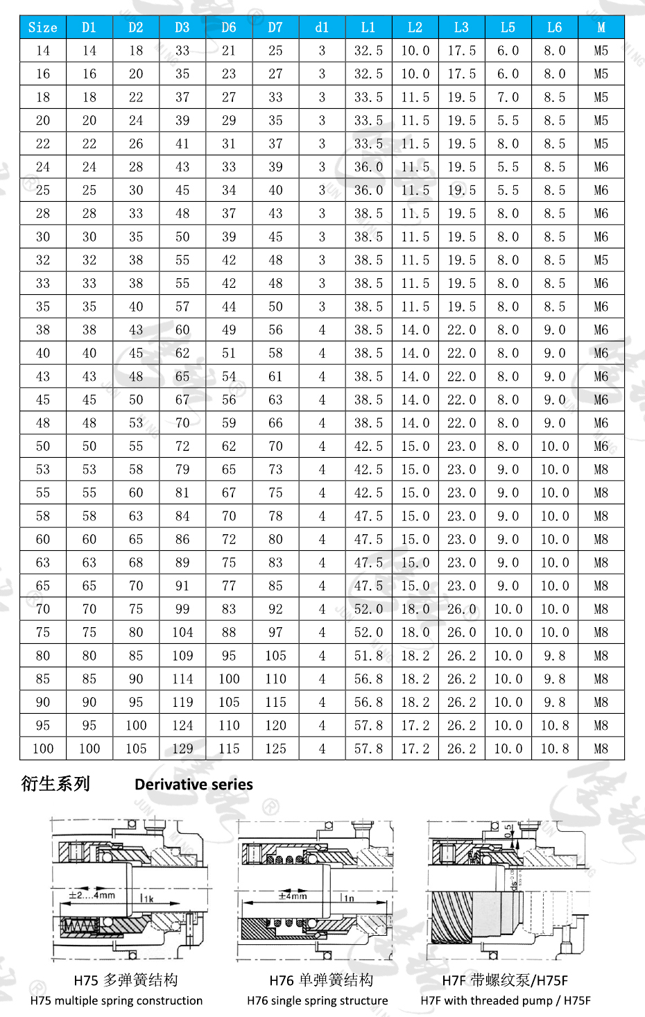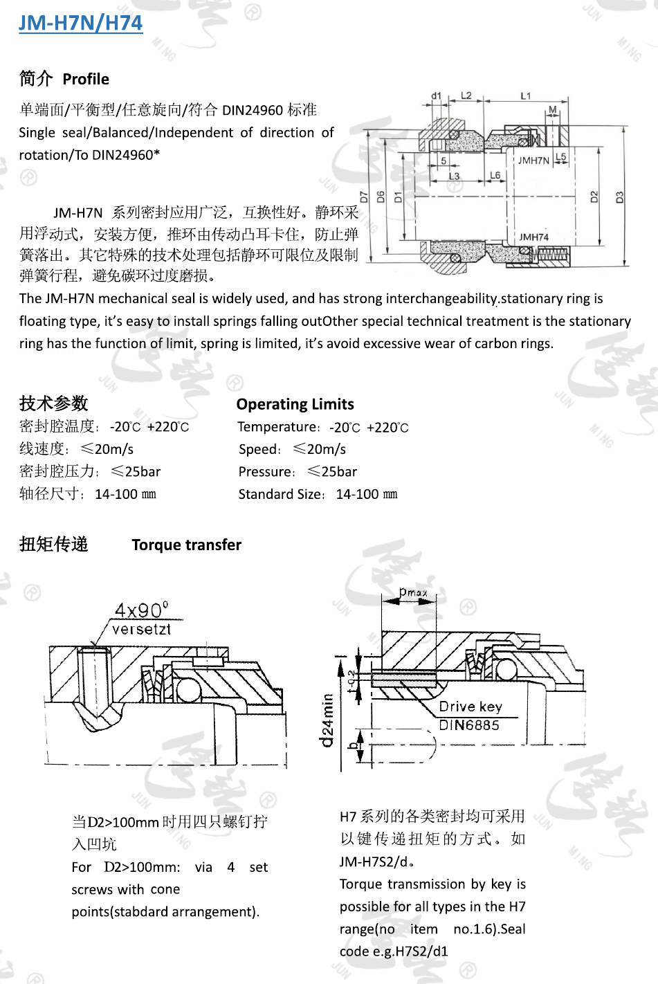 單端面/平衡型/任意旋向/符合DIN24960標準 H7N系列密封應用廣泛,互換性好。靜環(huán)采用浮動式,安裝方便,推環(huán)由傳動搭子卡住,防止彈簧落出。其它特殊的技術處理包括靜環(huán)可限位及限制彈簧行程,避免碳環(huán)過度磨損。