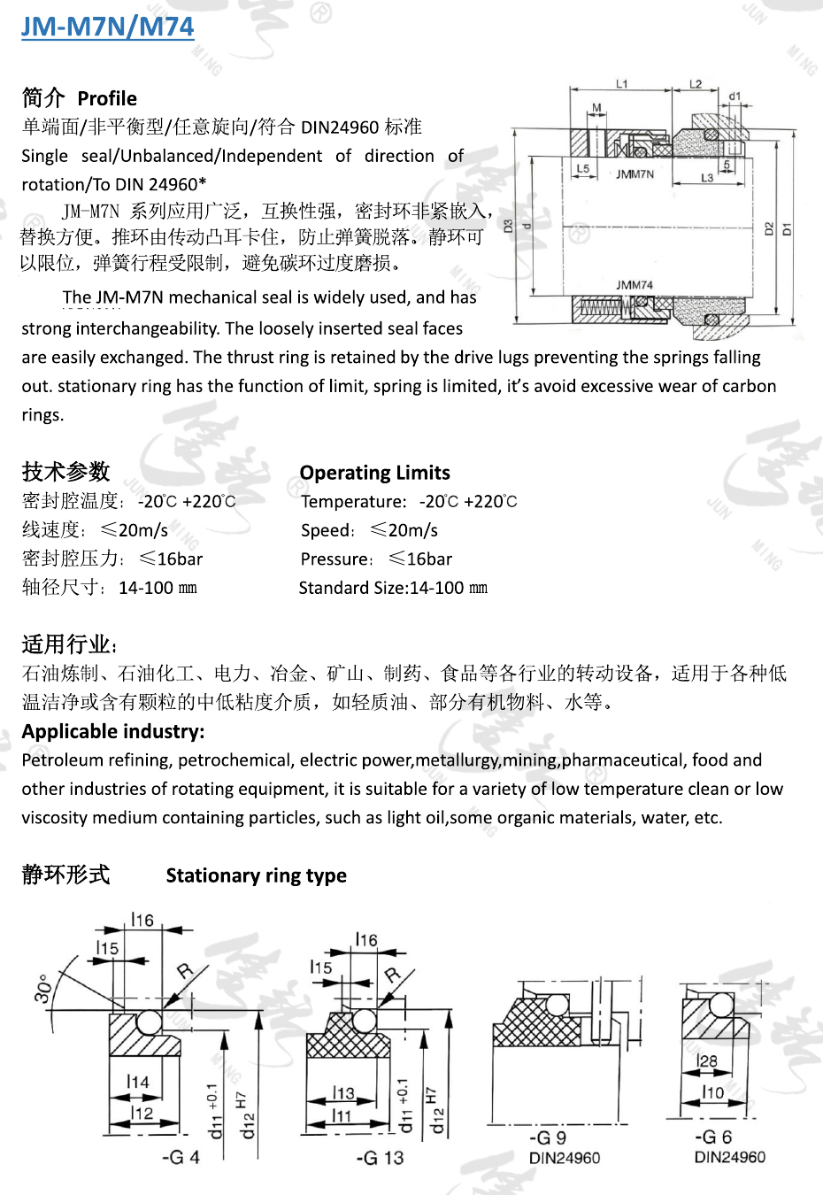 M7N系列應(yīng)用廣泛,互換性強(qiáng),密封環(huán)非緊嵌入,替換方便。推環(huán)由傳動(dòng)搭子卡住,防止彈簧脫落。靜環(huán)可以限位,彈簧行程受限制,避免碳環(huán)過度磨損。